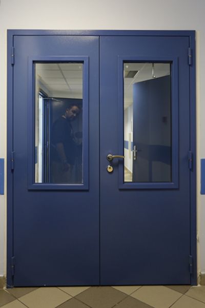 Противопожарная алюминиевая дверь синего цвета в Красногорске