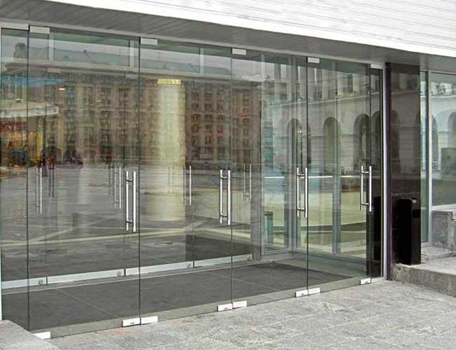 Противопожарная безрамная дверь со стеклом в торговый центр в Красногорске